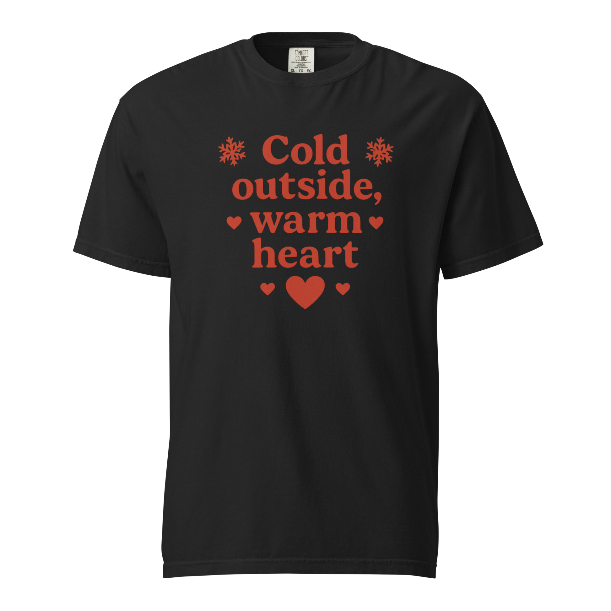 Embrace the contrast of winter and warmth with this Cold Outside, Warm Heart T-shirt. Featuring bold red typography, heart icons, and snowflake details on a classic black background, this design delivers a cozy and romantic message with a modern seasonal touch.