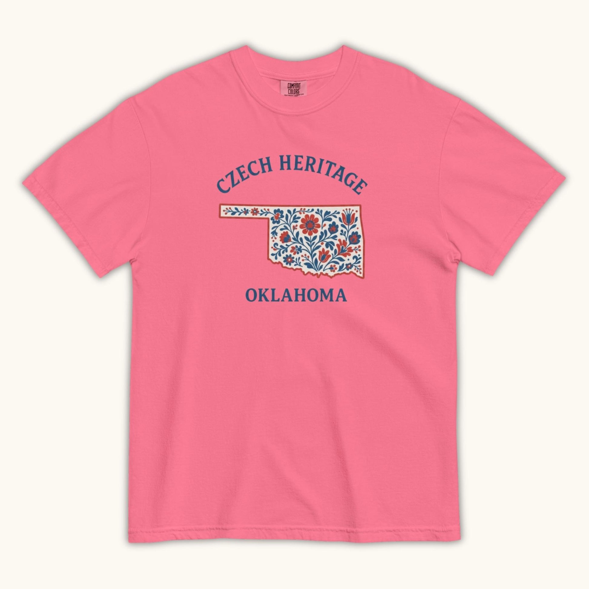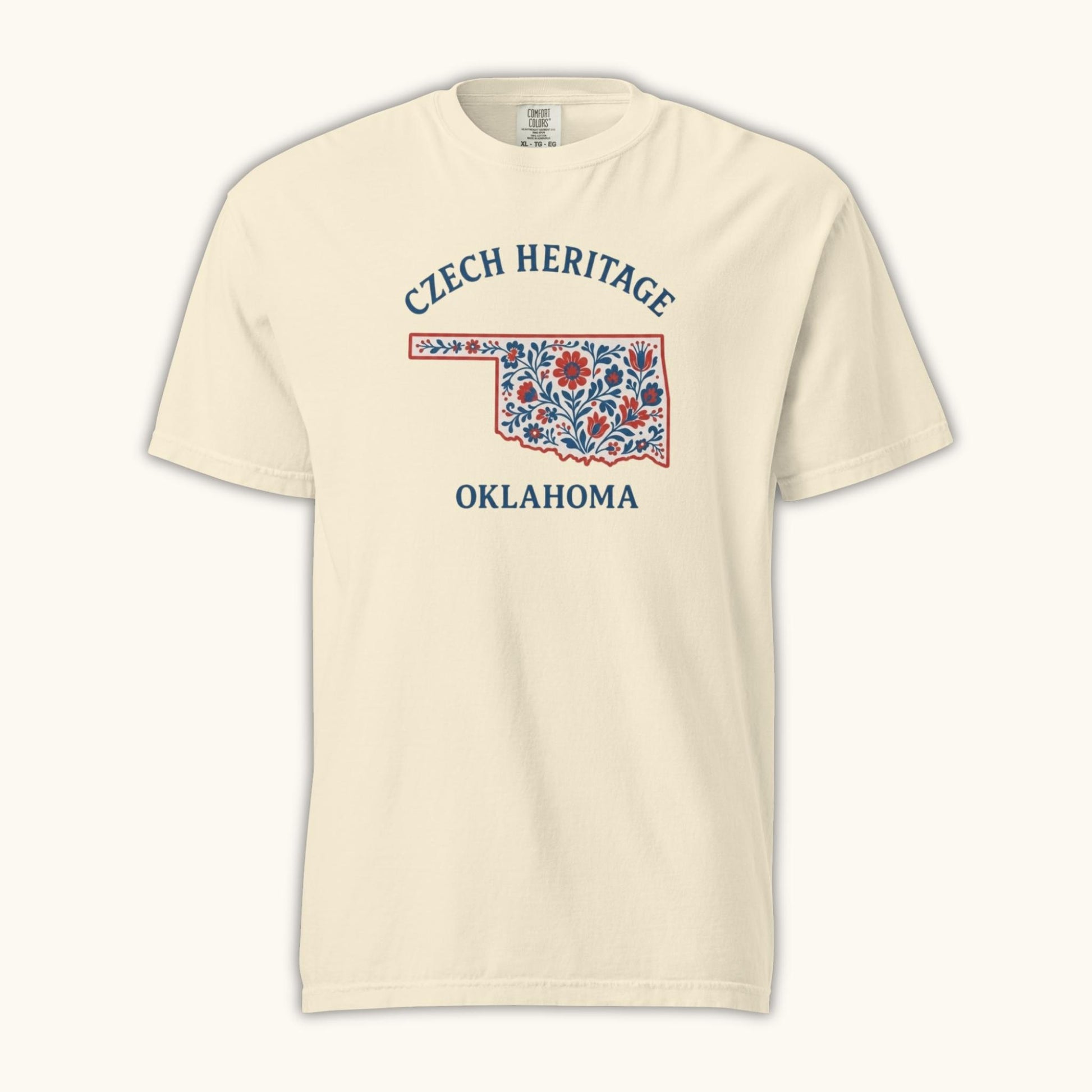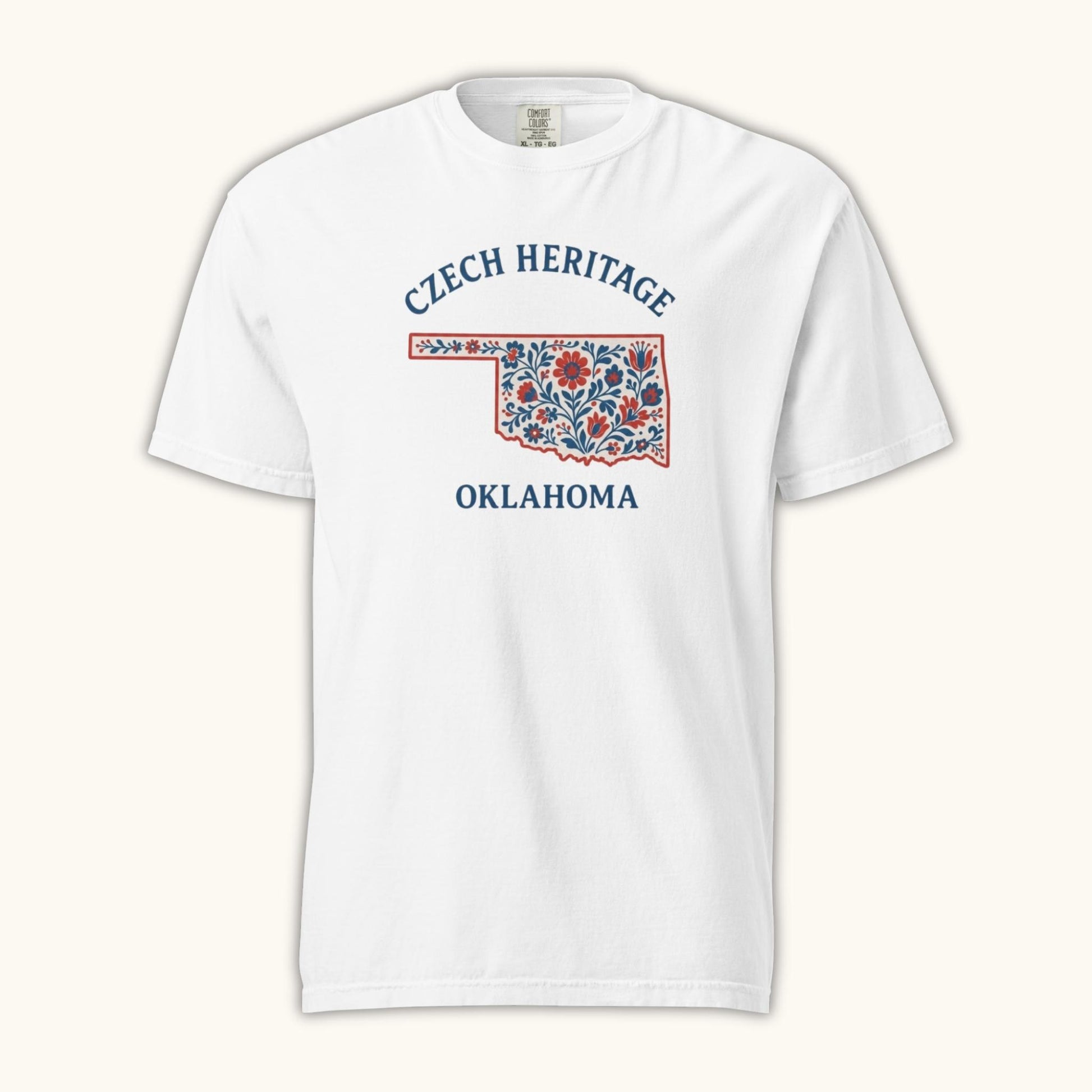 Celebrate Czech heritage in the state of Oklahoma with this “Czech Heritage Oklahoma” unisex t-shirt. Featuring the outline of Oklahoma filled with a traditional Czech folkloric floral pattern, this design honors the deep roots of Czech immigrants and descendants who helped shape the cultural history of the state.