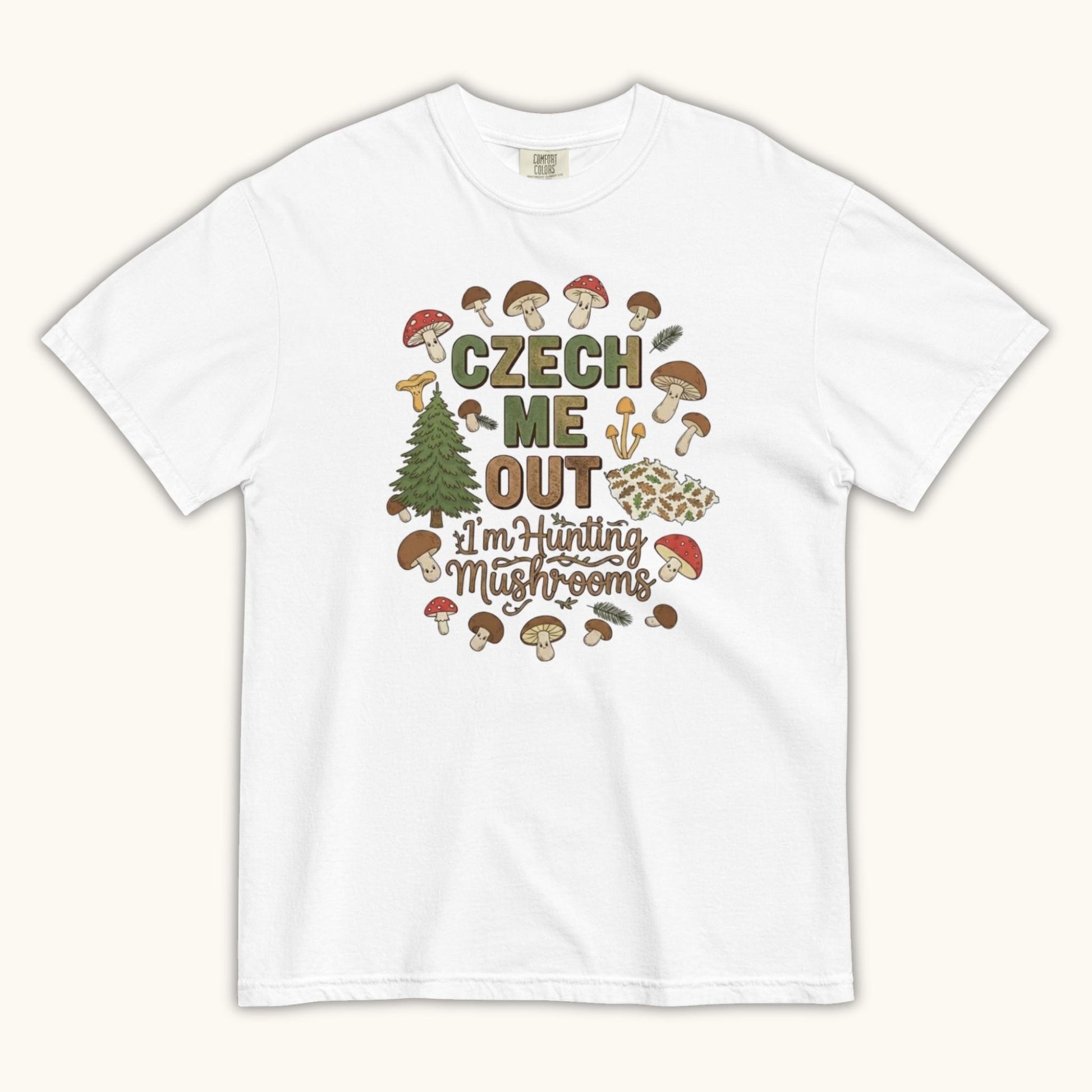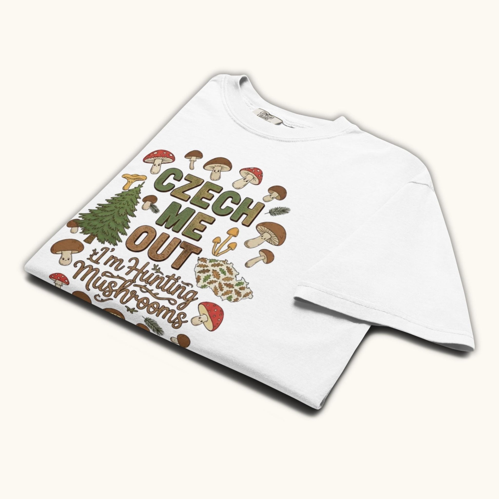“Czech Me Out I’m Hunting Mushrooms” combines humor, Czech culture, and the beloved tradition of mushroom foraging. Featuring adorable illustrated mushrooms, pine trees, and forest elements, this design perfectly captures the charm of Czech and Central European mushroom-picking culture.