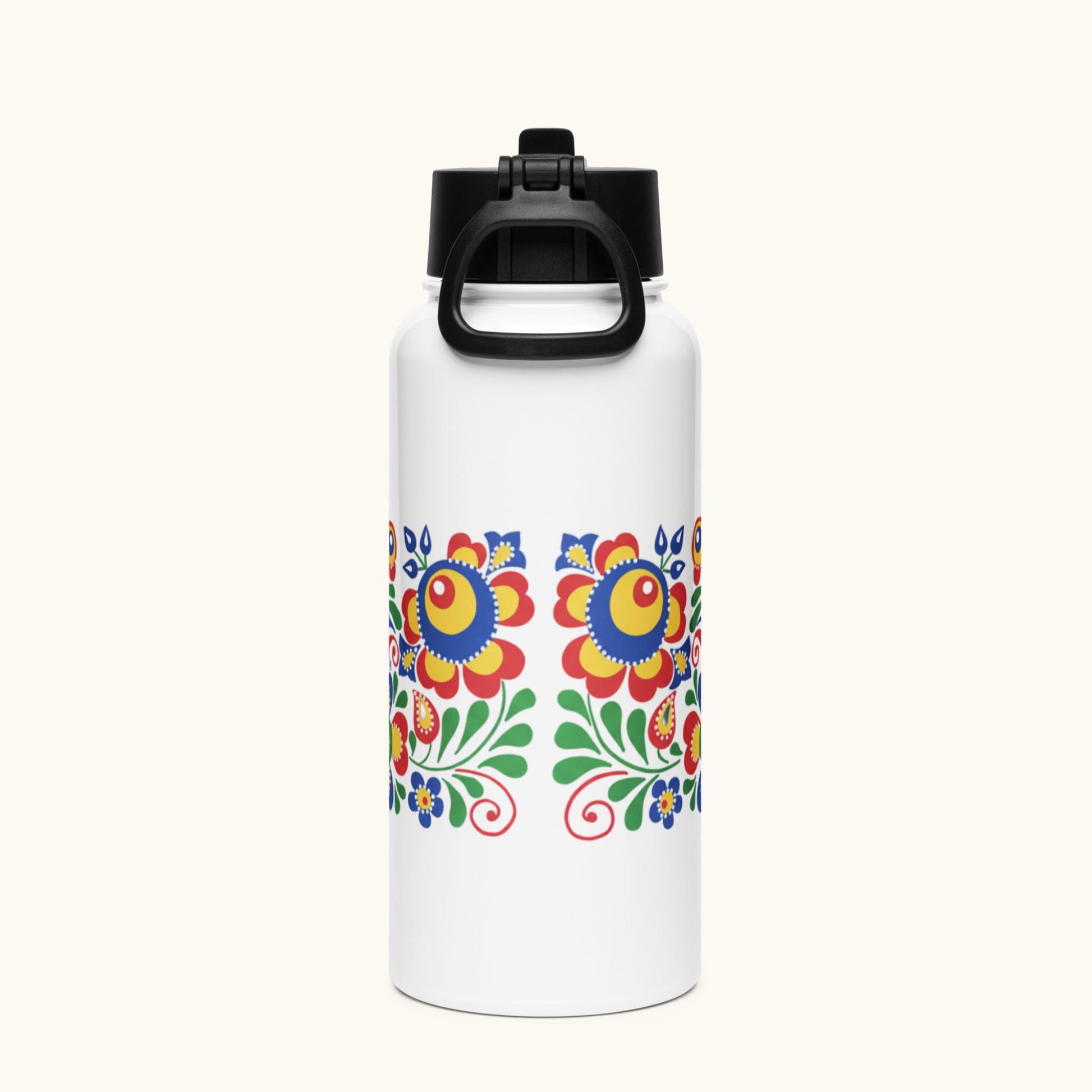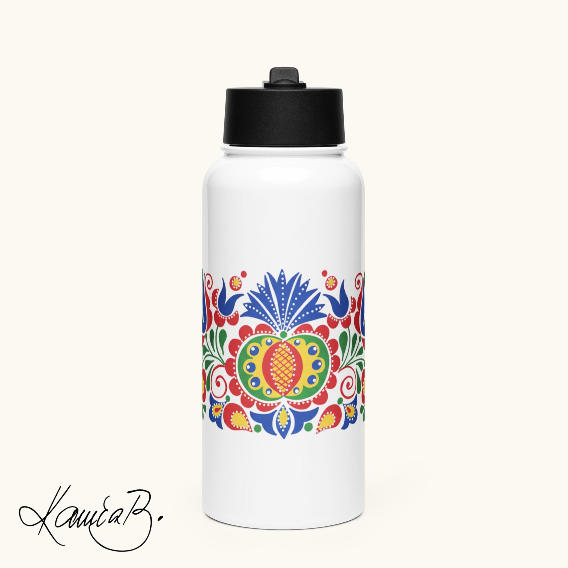 This premium 32 oz (950 ml) stainless steel water bottle features an  folk-art design created by artist Kamila Bartálová specifically for our store. Rich in vibrant colors and traditional Moravian-inspired patterns, the artwork wraps around the bottle, turning a daily essential into a piece of cultural expression.
