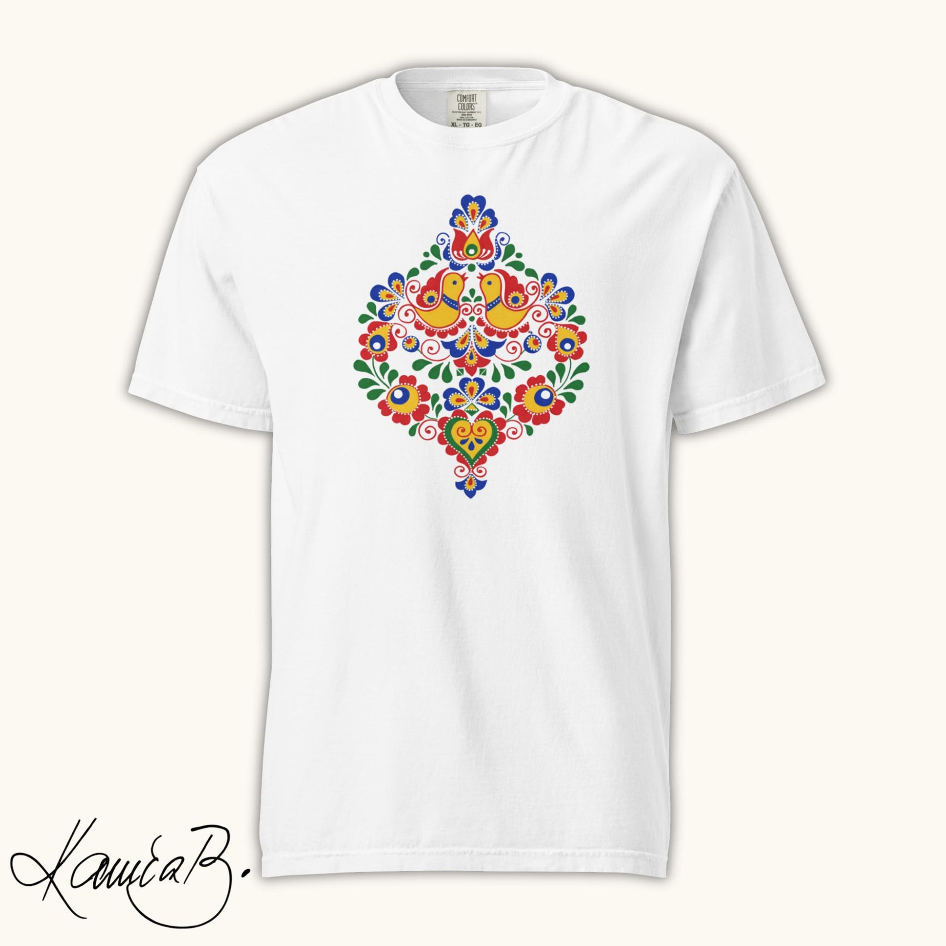 Celebrate the beauty of traditional Czech folklore with this exclusive “Folk Heart Harmony” women’s t-shirt, designed by acclaimed Czech artist Kamila Bartálová. This intricate illustration features vibrant floral motifs and symbolic birds arranged inside a heart-shaped pattern a timeless tribute to Moravian and Bohemian heritage.