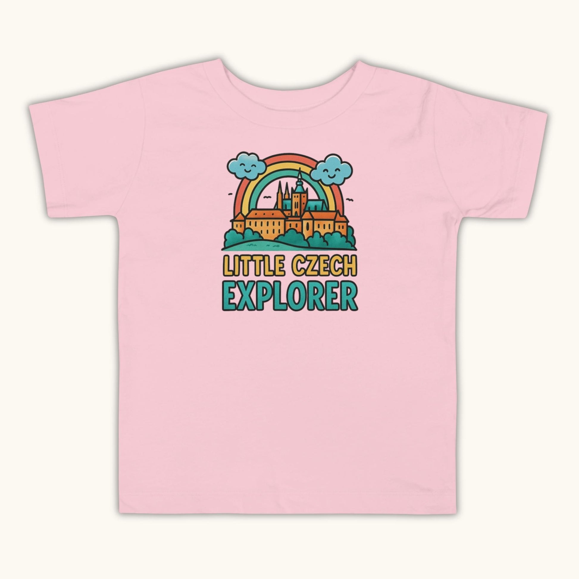 Perfect for curious little adventurers! This “Little Czech Explorer” toddler tee features a colorful illustration of Prague Castle under a cheerful rainbow  a fun and adorable way to celebrate Czech heritage.