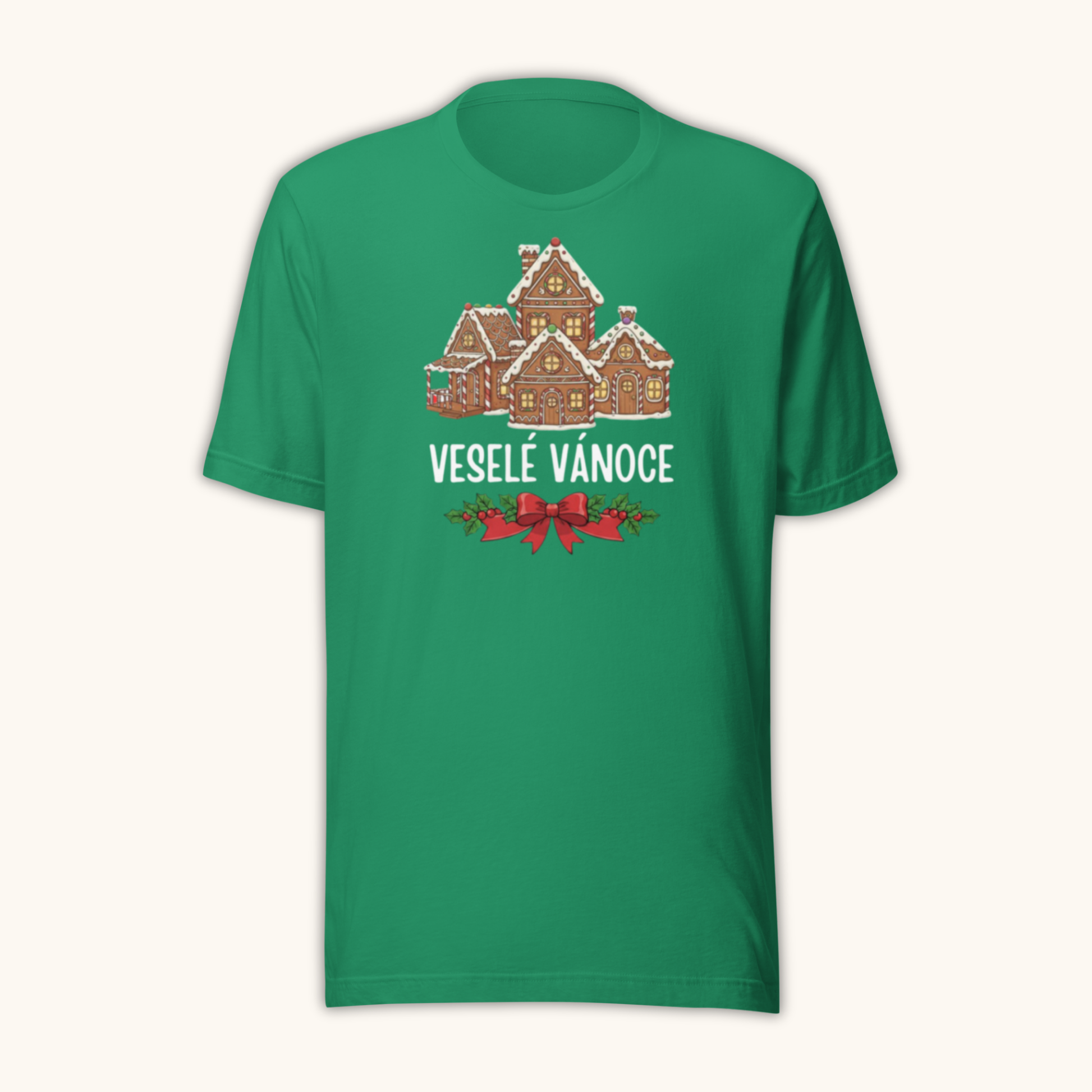 Embrace the warmth and charm of Czech Christmas traditions with the “Veselé Vánoce Gingerbread Houses” women’s t-shirt. Featuring beautifully illustrated gingerbread-style homes, paired with festive holly and a decorative bow, this design brings the cozy magic of European holiday villages to life. It’s a sweet and nostalgic tribute to winter celebrations.