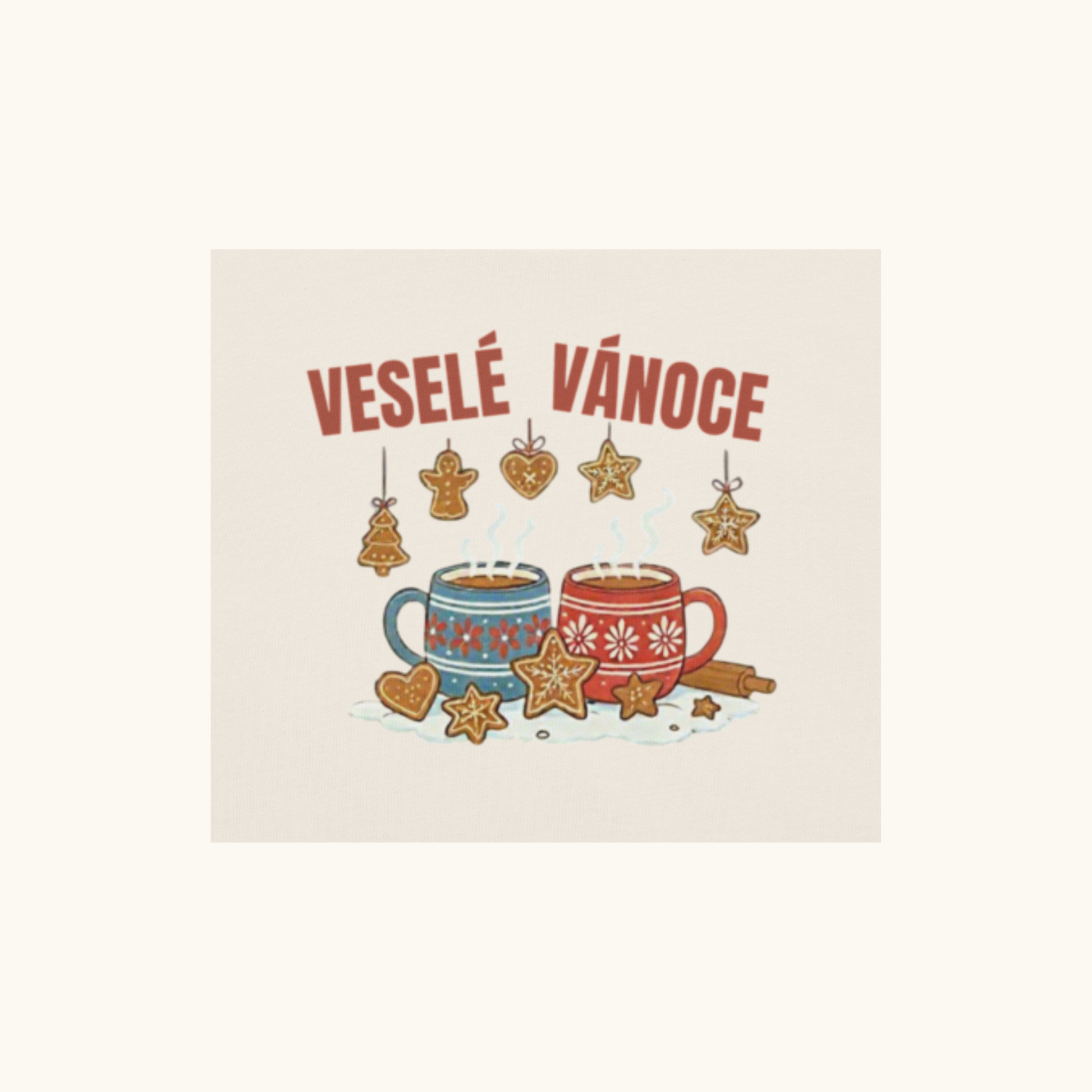 Celebrate the warmth and coziness of Czech Christmas with the “Veselé Vánoce Holiday Mugs” unisex t-shirt. Featuring two festive mugs filled with steaming holiday drinks and surrounded by gingerbread cookies, this charming illustration captures the comforting spirit of winter gatherings. The Czech greeting “Veselé Vánoce” adds authenticity and cultural charm.