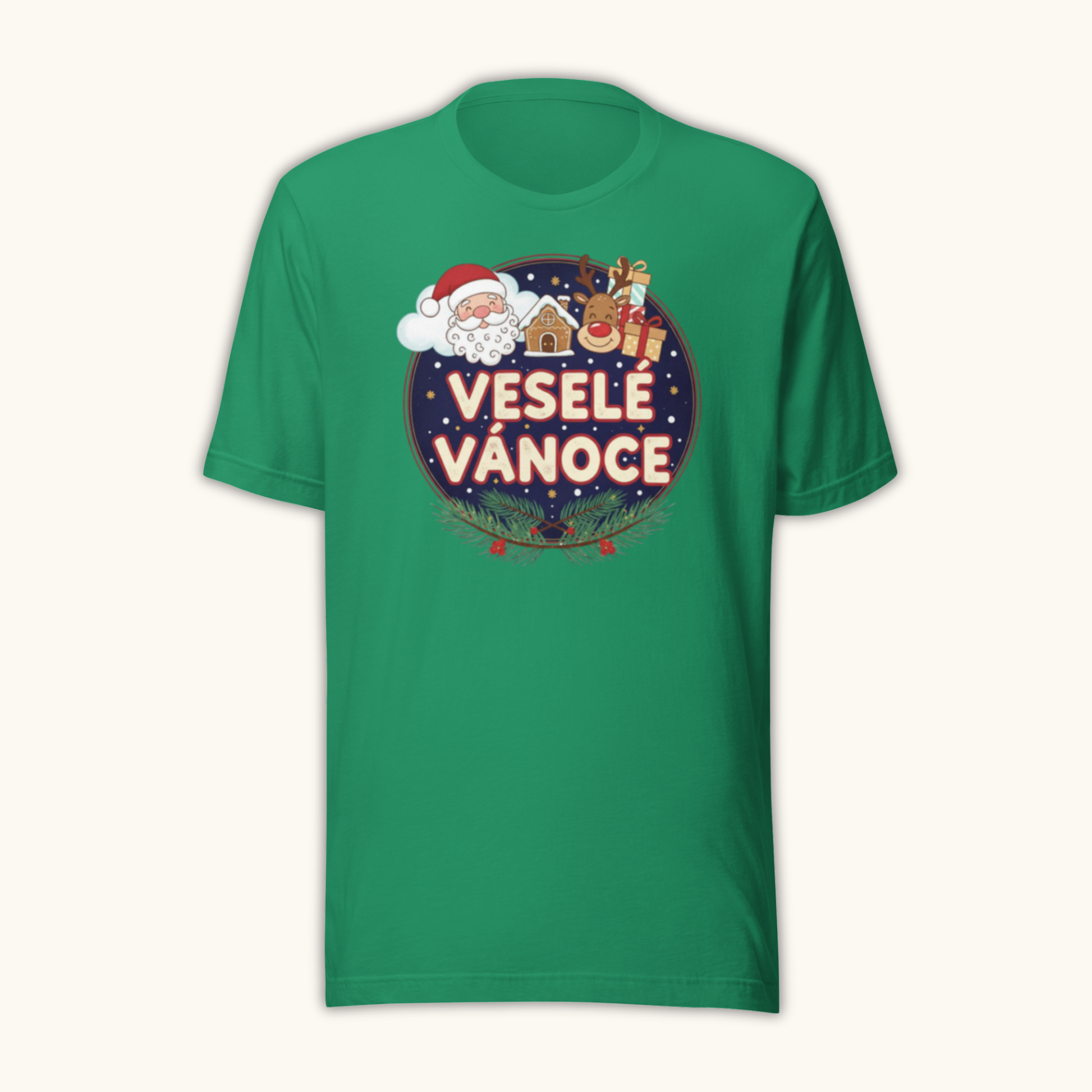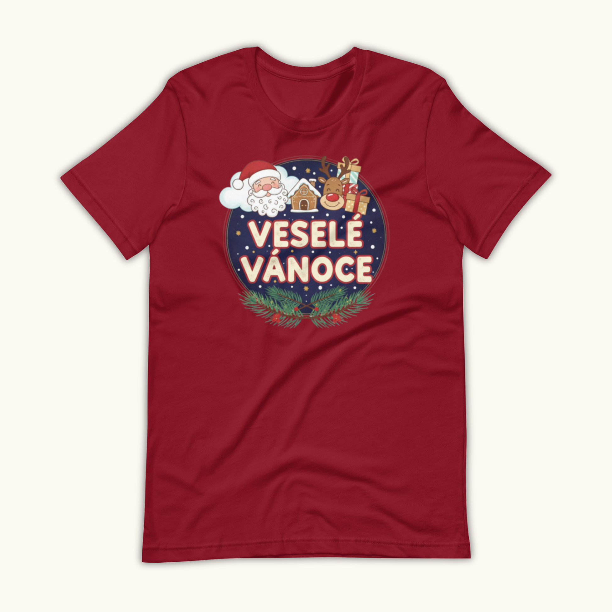 Celebrate Czech Christmas with cheerful color and warm holiday spirit in the “Veselé Vánoce Santa & Gifts” unisex t-shirt. Featuring a joyful Santa Claus, festive gifts, a gingerbread house, and winter pine branches, this design brings together all the magic of the season. The Czech greeting “Veselé Vánoce” makes it a meaningful and authentic holiday piece.