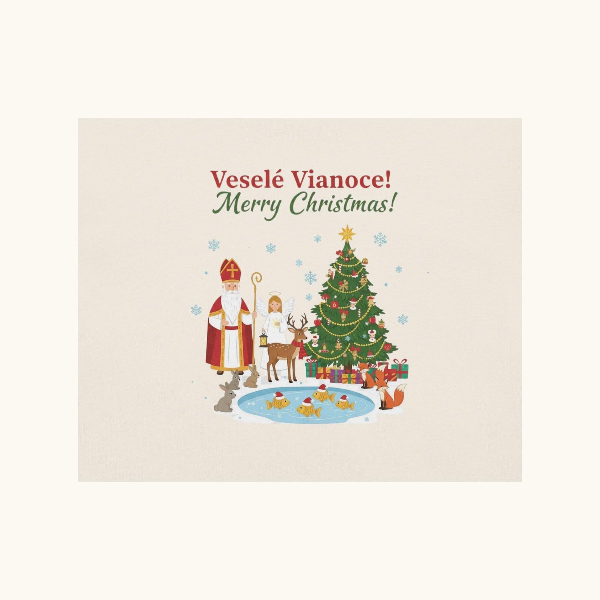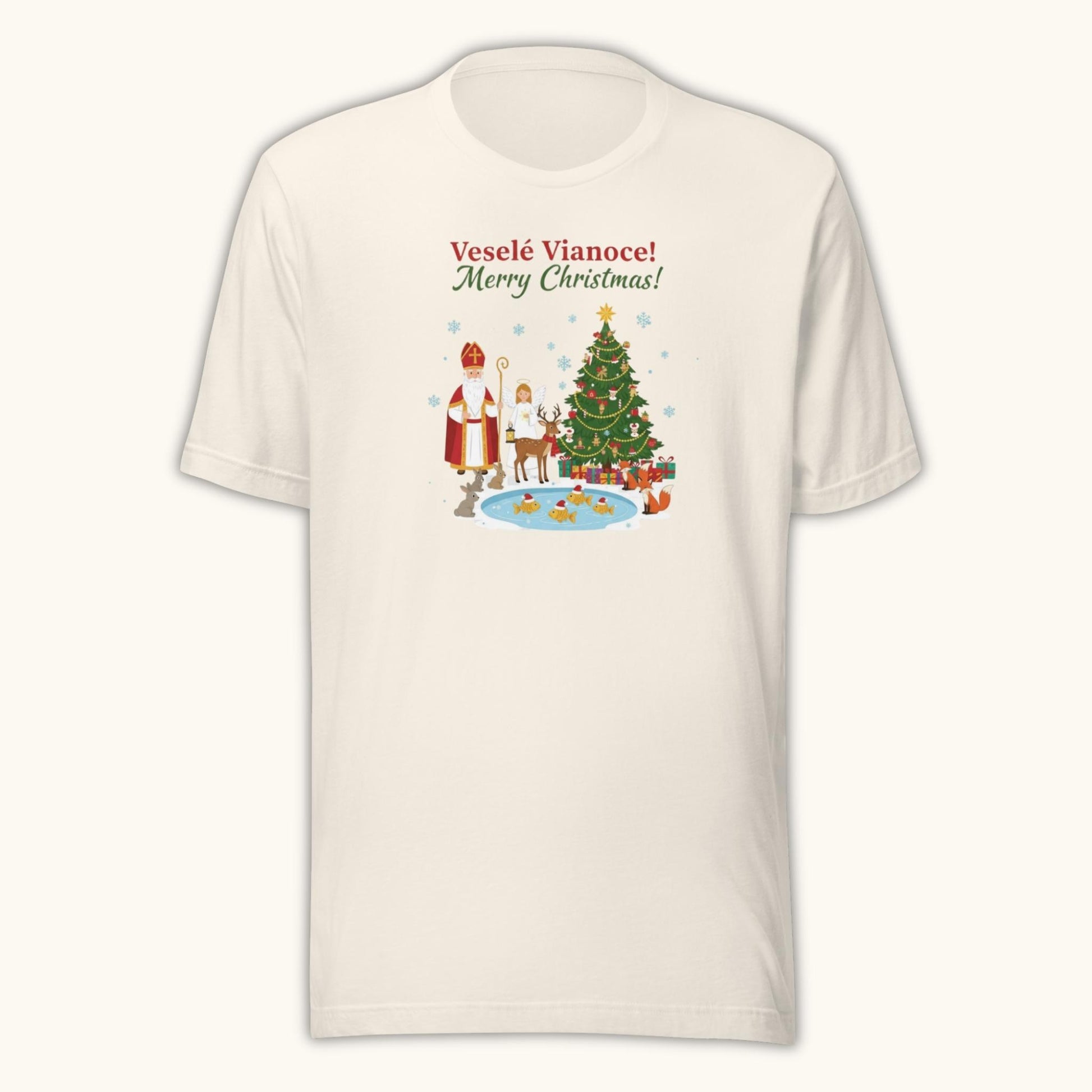 Celebrate the magic of Slovak Christmas with the “Veselé Vianoce – Merry Christmas” unisex t-shirt. Featuring a beautiful festive illustration with St. Nicholas, an angel, a reindeer, a decorated Christmas tree, and traditional holiday carp, this design captures the warm and joyful spirit of Christmas in Slovakia.