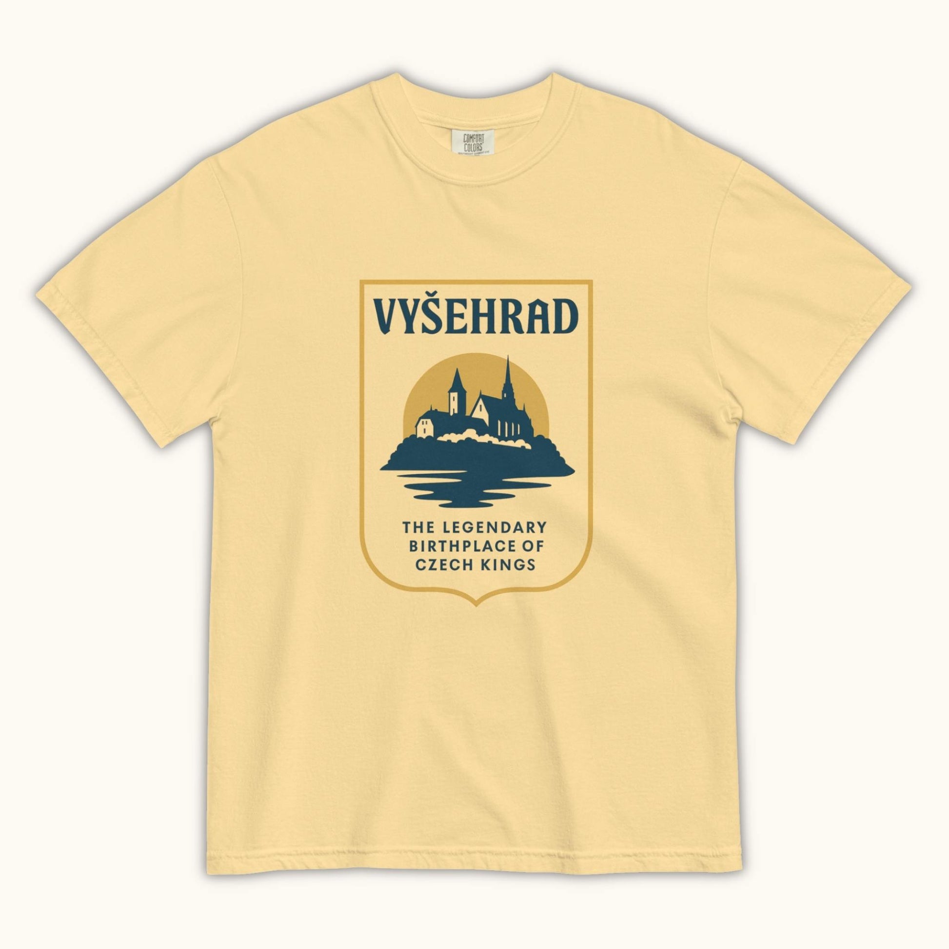 Honor one of Prague’s most legendary landmarks with the “Vyšehrad – Birthplace of Czech Kings” unisex t-shirt. Featuring a bold silhouette of the iconic Vyšehrad fortress and its twin-spired basilica, this design pays tribute to the mythical origins of Czech royalty and one of the oldest historic sites in the country. The warm color palette and shield-like framing give it a classic heritage look.